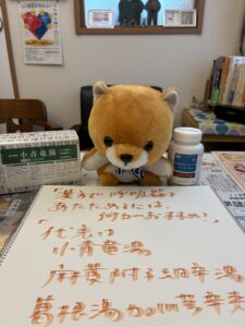 、葛根湯加川キュウ辛夷などがありますよ。鼻水がサラサラしてる人は肺が冷えてるよ。鼻が黄色くてネバネバしてる人は肺に熱を持ってるので、温めるものより、肺の熱を冷ます方がいいです。なので人によって違うので相談してくださいね。」