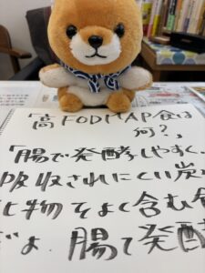 「腸で発酵しやすく、吸収されにくい炭水化物をよく含む食品だよ。腸でガスを発生してお腹がパンパンになり、下痢や腹痛を起こしやすくするよ。小麦粉製品を2週間ぐらいやめて、腸活にいいと言われる納豆、ゴボウ、モモ、玉ねぎ、牛乳、ヨーグルトもやめて様子みてくださいね。それで改善されるようなら、SIBOシーボかもしれませんよ。」